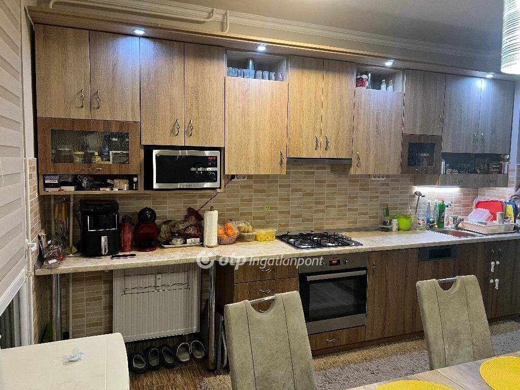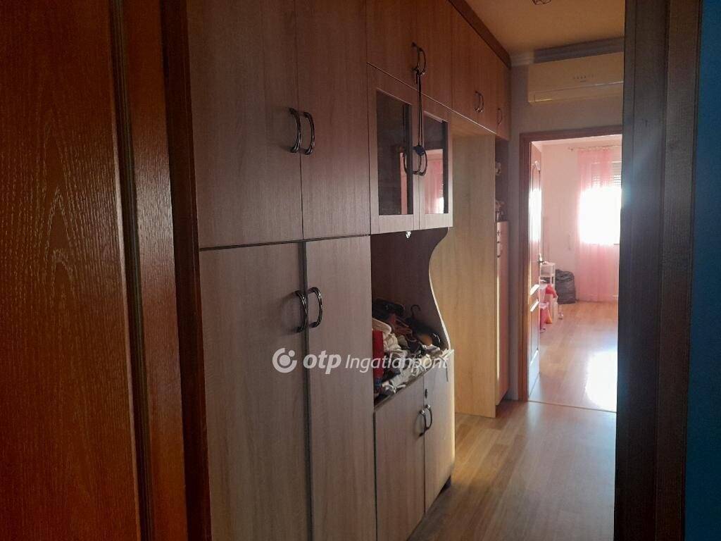 Záhonyban, központhoz közeli utcában eladó egy 71 m2-es, igényesen felújított lakás. A társasház panelből 1989-ben épült, mely a külső felújítás során 10 cm szigetelést kapott. A lakás műanyag hőszigetelt nyílászárókkal és redőnnyel van ellátva. Fűtése: távhő, radiátoros hőleadással, illetve a nappaliban egy elektromos kandalló is meleget biztosít a hidegebb napokon. Melegvíz ellátás szintén távhőn keresztül valósul meg. Nyáron a felszerelt klíma segít elviselni a melegebb napokat. Az ingatlan elosztása: 2 szoba, nappali, konyha + étkező, fürdőszoba, WC, kamra, mosókonyha, 2 erkély. Egy közös tároló is tartozik a lakáshoz. A konyhában egyedileg készített konyhabútor beépített főzőlappal, sütővel és mosogatógéppel biztosítja a mindennapi igények kiszolgálását. Nagy tárolófelületet biztosít a közlekedőben elhelyezett beépített szekrény.