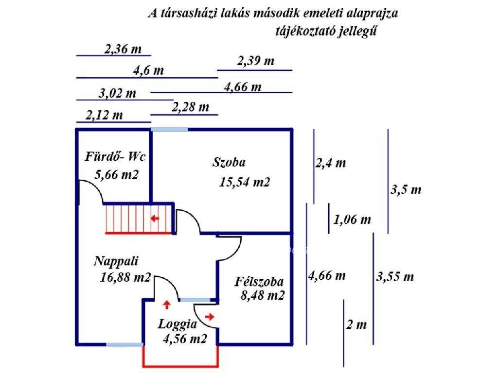 A második emelet egy nappalival, egy szobával, egy félszobával, egy fürdőszoba- WC helyiséggel és egy loggiával rendelkezik. A nappali és a szobák laminált padló-, a többi helyiség járólap burkolatot kapott.