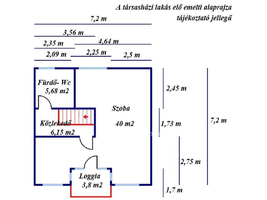 Az első emeleten egy szoba, egy fürdőszoba- WC helyiség, egy közlekedő és egy loggia található. A szoba parketta-, a többi helyiség járólap burkolatot kapott.