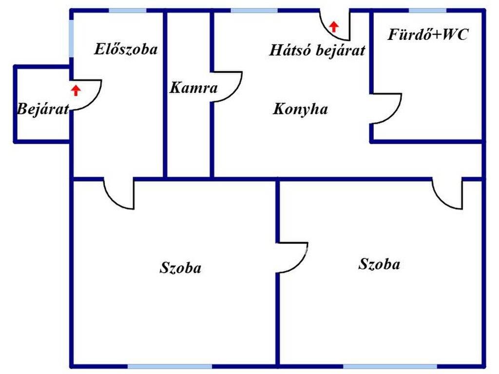 Az ingatlan jelenlegi elrendezése praktikus, ugyanakkor kiválóan alakítható az új tulajdonos igényei szerint. Helyiségei: két külön nyíló szoba, konyha, fürdőszoba WC-vel egyben, kamra és előszoba. A ház terméskő alapra épült, vályog falazattal rendelkezik, tetejét pala fedi.