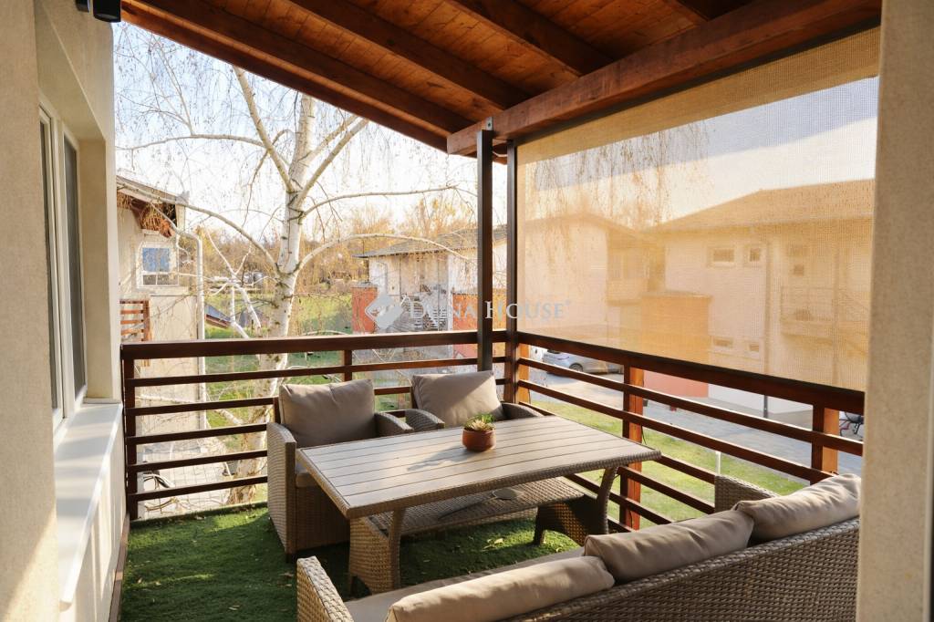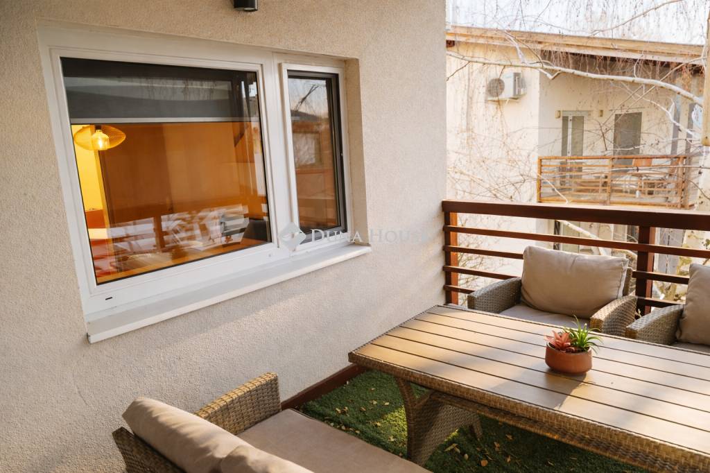 A lakás egyik különlegessége a műfűvel borított fedett terasz, amely kényelmes kerti bútorokkal felszerelt tökéletes helyszín reggeli kávézáshoz vagy esti pihenéshez.
