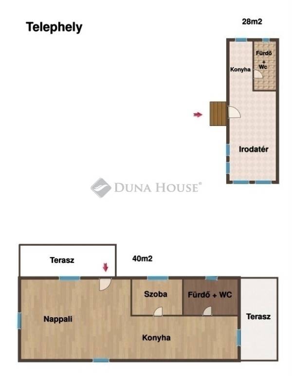 Helyiségek: Nappali + 1 szoba, fürdő+WC, konyha.