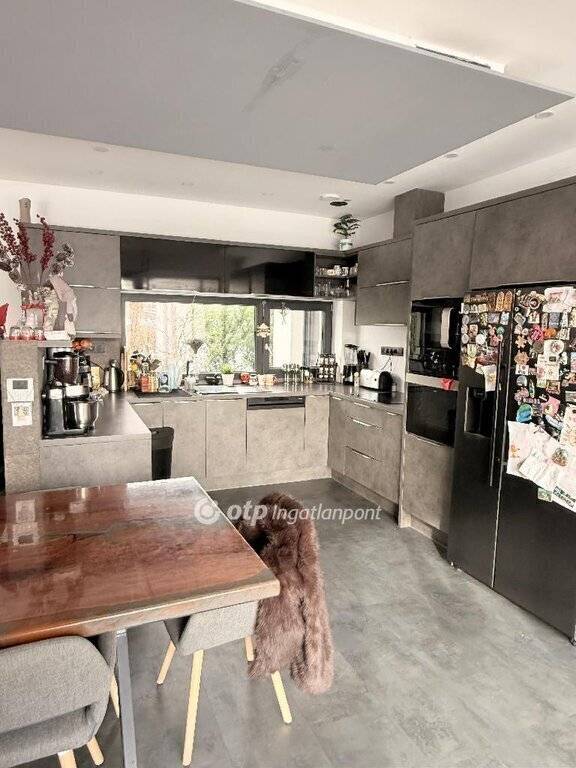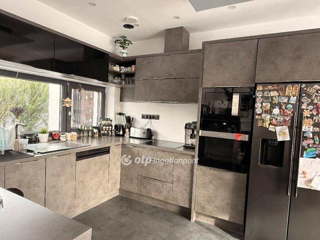 A modern konyha minőségi beépített gépekkel felszerelt, így a mindennapi használat mellett vendégfogadásra is tökéletes.