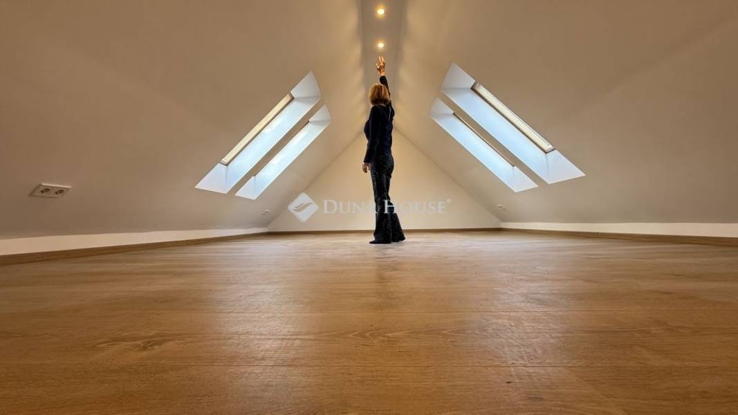 A felső emeleten egy fényárban úszó nagy nappali fogad - étkezővel, tetőablakokkal és dekoratív tetőgerendákkal ellátott magas helyiségekkel, egy jól felszerelt Nolte konyhával, 3 tágas hálószobával, 2 fürdőszobával, 2 nagy erkéllyel és egy fa laminált padlóval burkolt beépített tetőrérrel rendelkezik , amelyhez már csak egy lépcső vagy létra feljáró szükséges. Minden szoba modern Daikin klímaberendezéssel van ellátva.