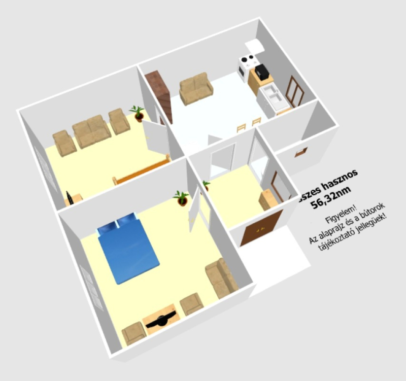 A kertes ház hasznos alapterülete 56,32nm, melyben található: