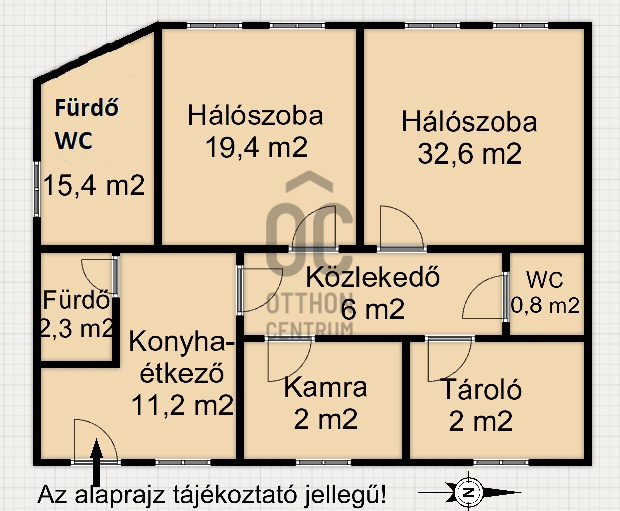 - helyiségek: 2 tágas hálószoba, közlekedő, konyha-étkező, kamra, 2 fürdő- WC, padlásfeljáró