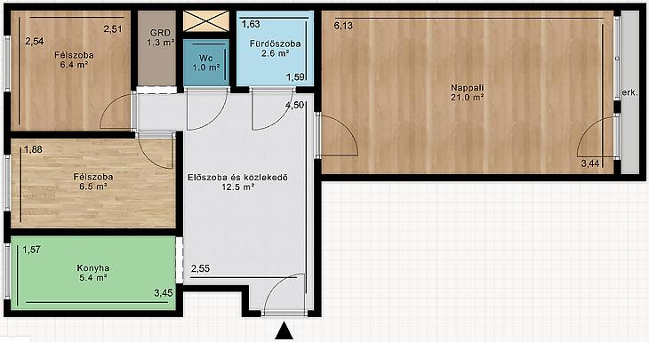 A szobákban laminált parketta található, míg a konyha, közlekedő és vizeshelyiségek járólappal burkoltak.