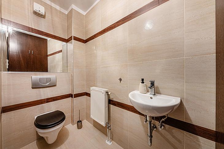 Az alsó szinten található egy különálló mosdó, még a felső emeleten egy beépített zuhanyzós ideális méretű fürdőszoba.
