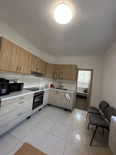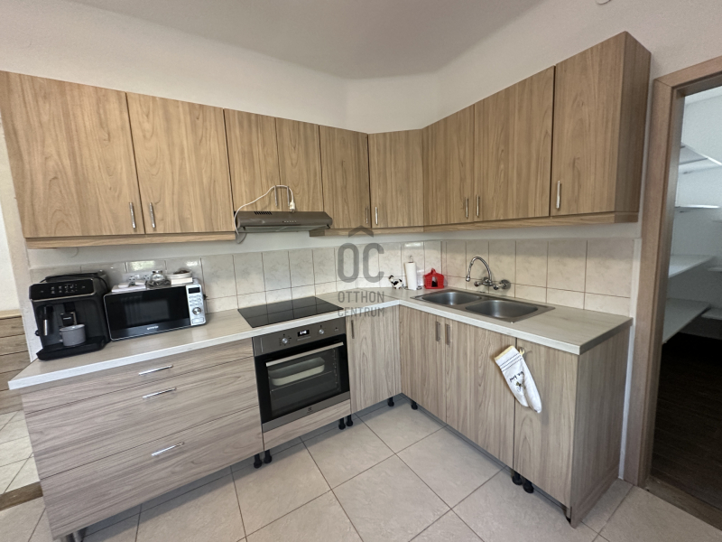 Innen balra egy tágas, 17 nm-es, parkettás, nagy belmagasságú szoba nyílik. A helyiség hangulatát az álmennyezetbe rejtett világítás, a beépített szekrénysor és a légkondicionáló teszi kényelmesen modernné. A közlekedő jobb oldalán található az étkezős konyha, amely vadonatúj bútorzattal felszerelt, ablaka pedig az udvarra néz. A konyhából nyílik egy praktikus, 8 nm-es, polcozott tárolóhelyiség is.