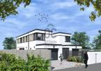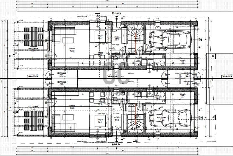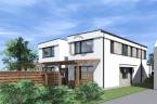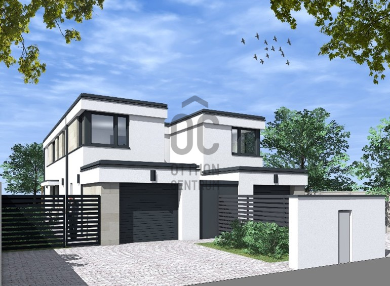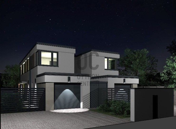 A telken kétlakásos lakóépület épül. A két épület egymástól elhúzva épül, !!!VAGYIS NINCS SEHOL KÖZÖS FAL!!! a kettő között elöl és hátul is szerelt jellegű kuka- és kertitároló kerül kialakításra, belső udvarral. Az épületek utca felől földszintes tömegűek, lapostetősek, egy-egy garázs épül. E mögött a földszinten került kialakításra a konyha-étkező-nappali hármasa, nagy fedett terasszal a hátsókert irányába. A földszinten egy előszoba, wc és háztartási helyiség került még kialakításra. A húzott karú lépcsőn feljutva, az emeleten 3-3 hálószoba, és fürdő lett kialakítva. Az épület lapostetős kialakítású, az emeleti lapostetőre való feljutás a garázs feletti lapostetőről lehetséges.