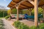 A ház egyik nagy előnye a gyönyörűen rendezett kert, amely ideális pihenésre, családi vagy baráti összejövetelekre. A pergola kellemes helyszínt biztosít a szabadtéri kikapcsolódáshoz, emellett a telek adottságai lehetőséget nyújtanak medence kialakítására is. (a medencés fotó látványterv)