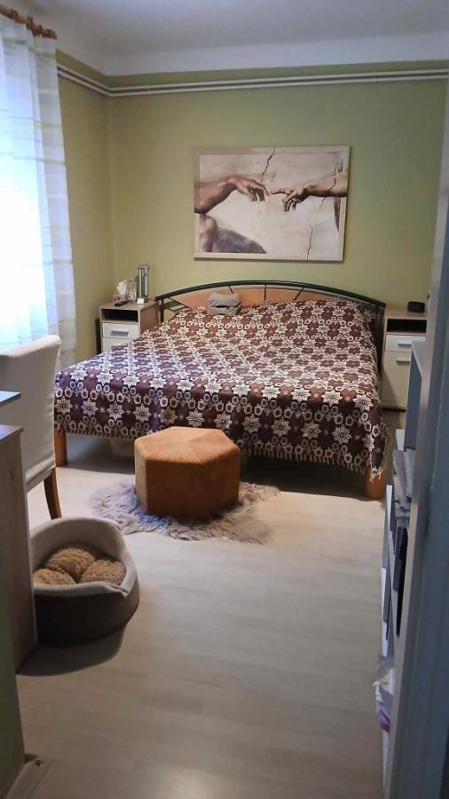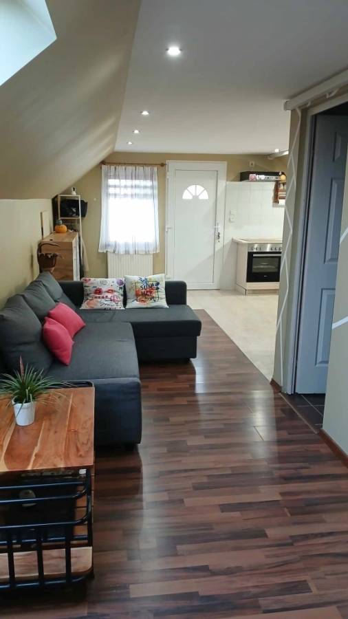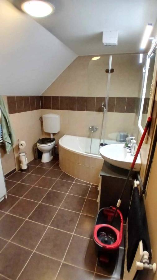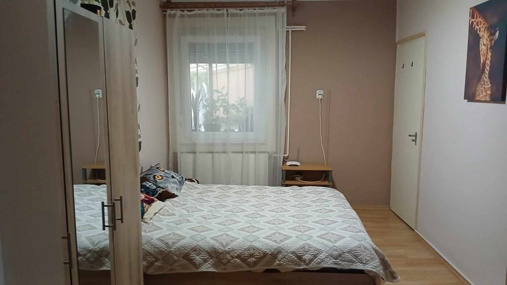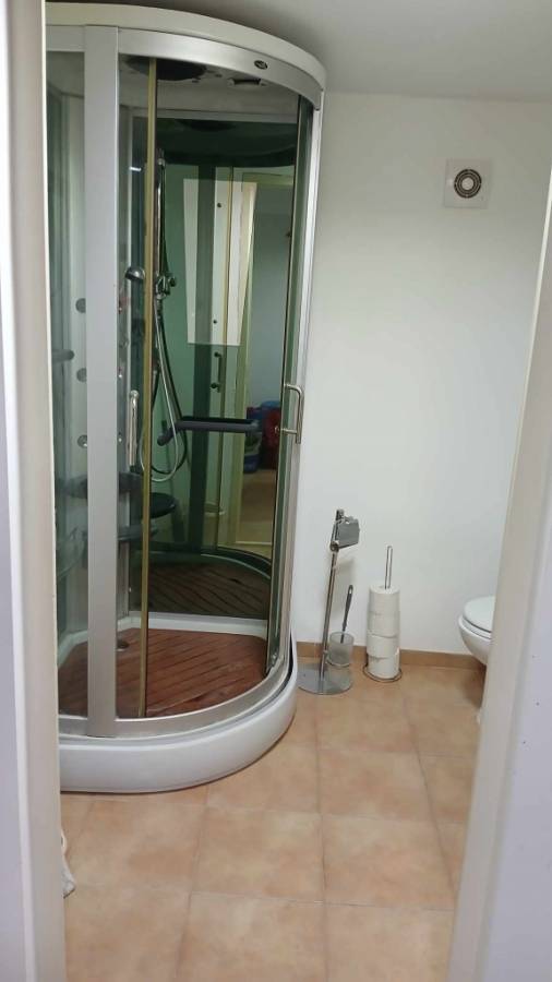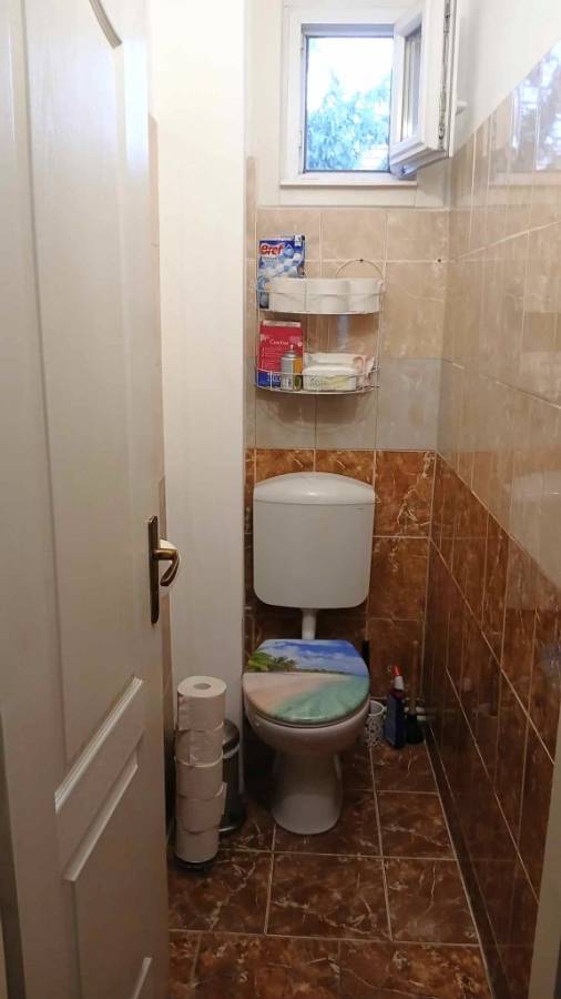 A hátsó részben egy nagy szoba, nagy zuhanyzós fürdőszoba-wc van. Innen külön ajtón is ki lehet jutni az udvarra. Klíma felszerelve. Az itt lévő szoba alatt pince van.
