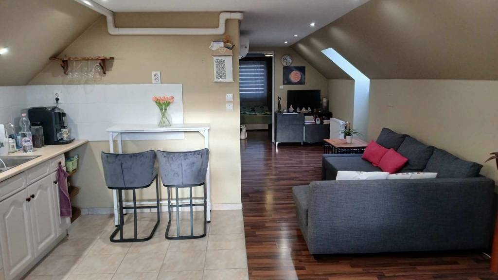 Külső feljárón tágas, 60 nm-es, amerikai konyhás nappali+2 szobás, fürdőszoba-wc-s lakásba érkezünk. Az egyik szobában nagyméretű gardróbszekrény könnyíti a holmik tárolását. Klíma felszerelve. Vízfogyasztás külön almérőről működik.