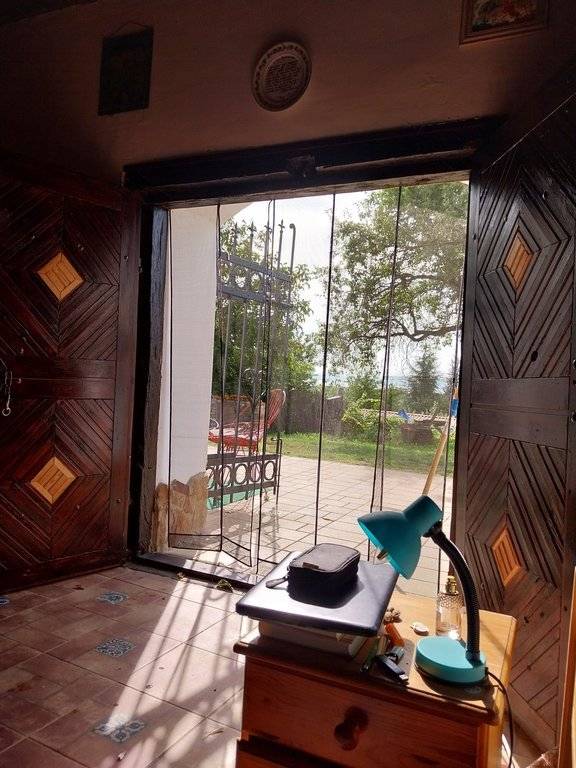 A présháznak két szárnyú régi stílusú, vastag faajtaja van klasszikusan, hatalmas kulccsal, előtte kovácsoltvas rács. A lakórészt és a száraz pincét is vastag, kétszárnyú faajtó választja el.