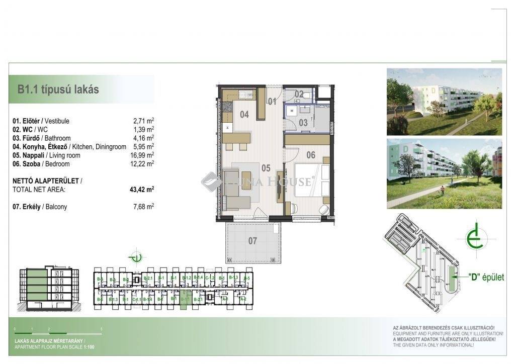 Az új épületben elsősorban garzonlakások, nappali + 1 , valamint nappali + 2 szobás otthonok kerülnek kialakításra, 35-69 nm közötti alapterületekkel.