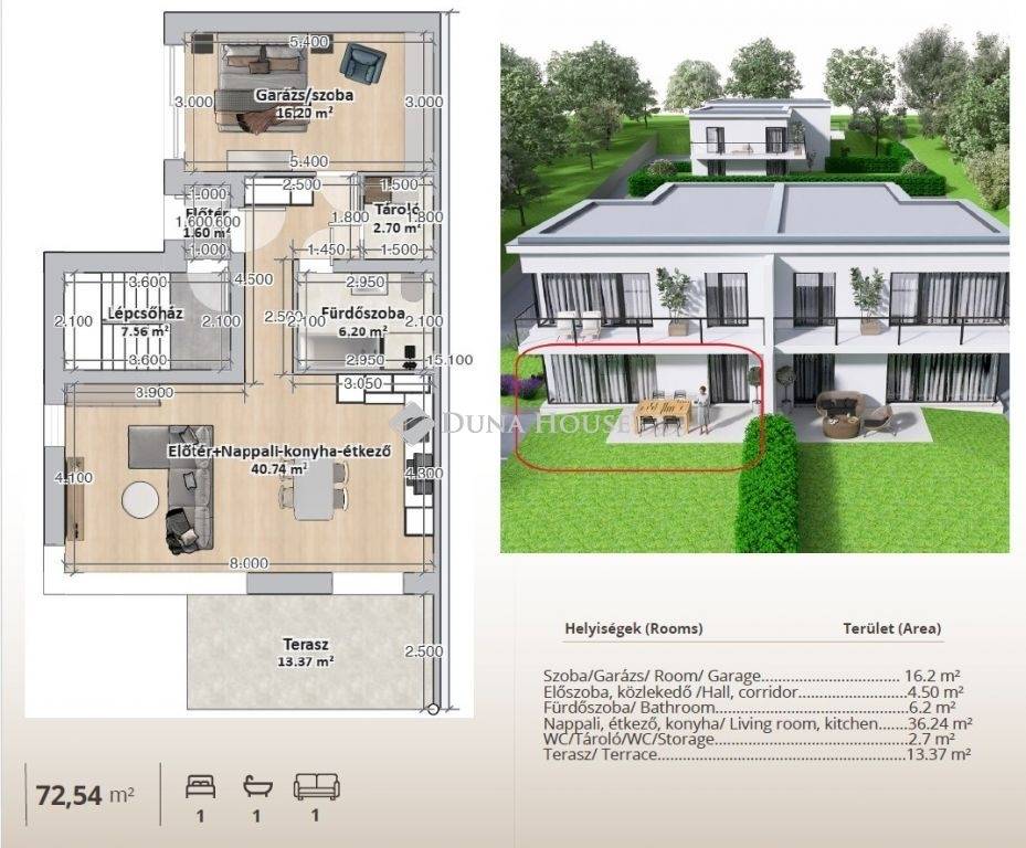 A lakások 72-75 nm közöttiek, a földszintek terasz- és kertkapcsolatokkal, az emeletiek erkéllyel.