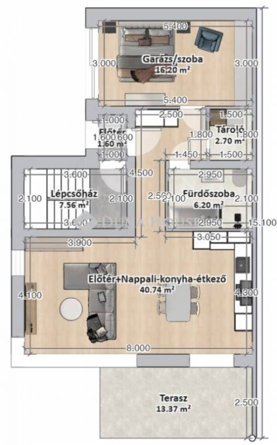 Két külön álló házban összesen 8 lakás valósul meg, a földszinteken, ill. az emeleten is 4-4 db.