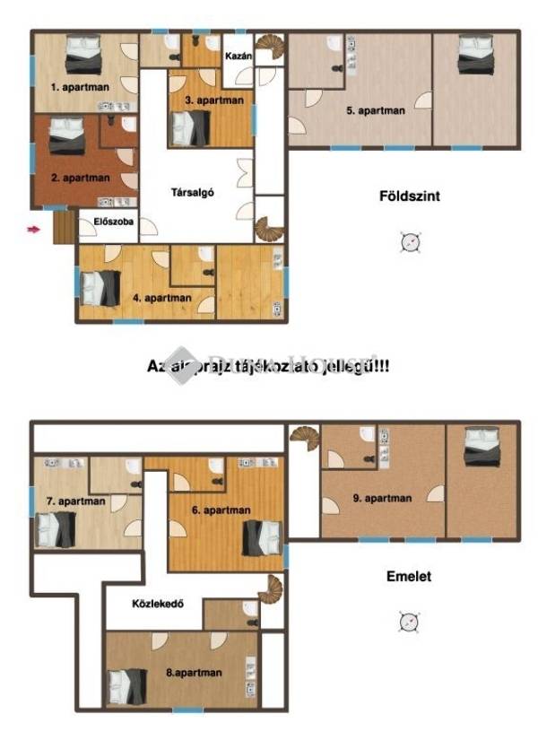 A földszinti részen megtalálható 5 apartam, az emeleten pedig, 4 apartman került kialakításra.
