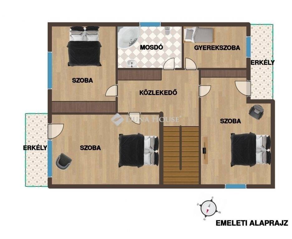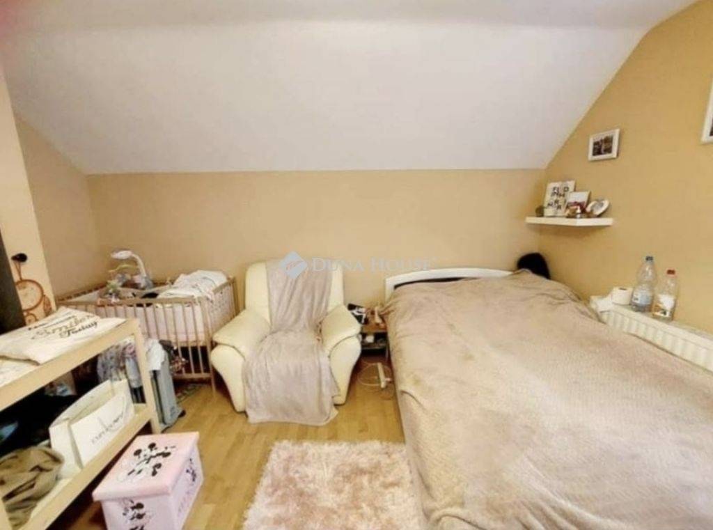 Az emeleti szint jól elkülönülő privát életteret biztosít, nagyobb család számára is kényelmes elosztással.
