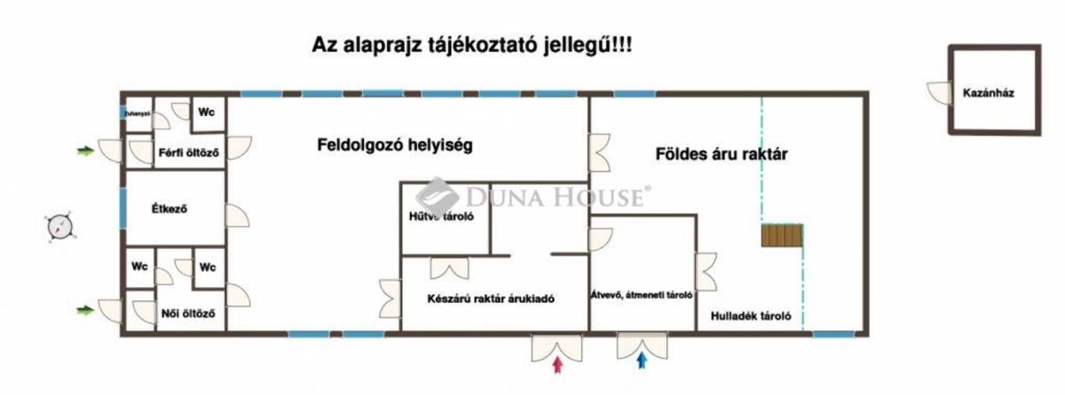 - Helyiségek: feldolgozó csarnok, hűtőtároló, készáru raktár, átvevő, étkező, férfi és női öltözők, zuhanyzó, WC