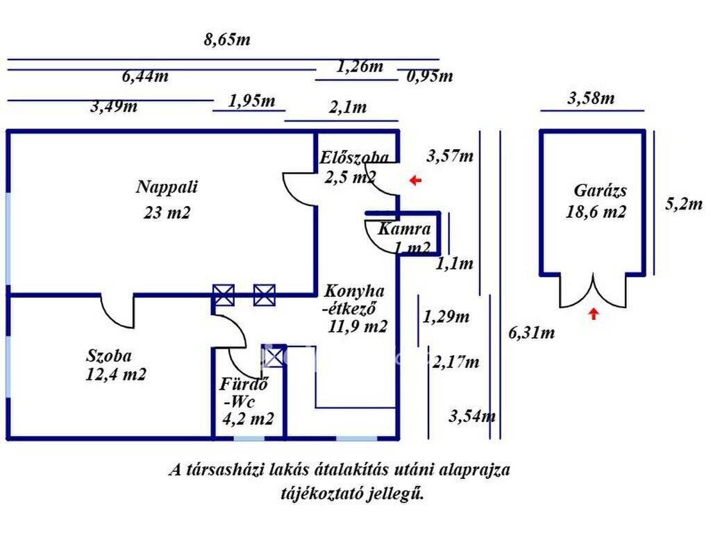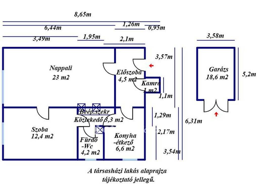Bács Kiskun vármegye, Kecskemét Műkertvárosi részén 56 m2 hasznos alapterületű tégla építésű lakás, 18 m2 nagyságú garázzsal eladó! Az 1973-ban épült ingatlan egy nyolclakásos kétszintes társasház 1. emeletén helyezkedik el. A komfortos lakás két szobából, egy konyha-étkezőből, egy kamrából, egy előszobából, egy fürdőszoba-WC helyiségből és egy közlekedőből áll. A szobák parketta-, a többi helyiség járólap borítást kapott. A külső nyílászárók műanyag hőszigeteltre cseréltek, redőnnyel és szúnyoghálóval ellátottak, a belsők eredeti fa szerkezetűek, normál állapotban vannak, a bejárati ajtó biztonságira cserélt. Az épület homlokzata 10 cm hőszigetelést és új kőporozást, a tető új vízszigetelést, a lépcsőház új hőszigetelt nyílászárókat kapott. A lépcsőház festése folyamatban van. A közművek közül az egyfázisú 32 Amper villany, Fi relével, a gáz- és a vezetékes víz-ellátás saját mérőórával, valamint a szennyvíz-elvezetés rendelkezésre állnak. Az otthon melegét helyiségenként gázkonvektor látja el, melyből kettő újracserélt, egy konvektor felújított. Alternatív megoldásként egy hűtő-fűtő klíma is beszerelésre került, valamint a lakás három vegyestüzelésű kéménnyel is rendelkezik. A melegvíz ellátásáról villanybojler gondoskodik. A lakás helyiségei átlagos állapotúak, tisztasági festés után jelen állapotában is lakható vagy igény szerint felújítható, átalakítható. Az ingatlanhoz közös parkosított udvar tartozik, mely körben bekerített. Az aszfaltozott útról kapubejáró és gépjármű tárolásra saját egyállásos garázs biztosított. A garázs saját villanyórával rendelkezik, elhelyezkedése kiváló, mert nincs előtte áthaladás, így a bejárata elé is zavartalanul lehet parkolni. Az udvaron közös használatú vízkivétel fúrt kútról rendelkezésre áll. A lakóközösség kifejezetten csendes, a lépcsőház zárt, tiszta, bejárata kaputelefonos rendszerrel nyitható. A földszinten közös használatú tároló biztosított. Az ingatlan elhelyezkedése kiváló, a közelben minden megtalálható: többféle bevásárlási lehetőség, iskola, óvoda, gyógyszertár, egészségügyi intézmény, játszótér, buszmegálló párszáz méteren belül elérhető. A lakás jelenleg üres, birtokba adás a teljes vételár kifizetését követően azonnal lehetséges. A hirdetés tájékoztató jellegű, az ingatlanról pontos adatokat a megtekintést követően a tulajdonos által elmondottak alapján tudunk garantálni!