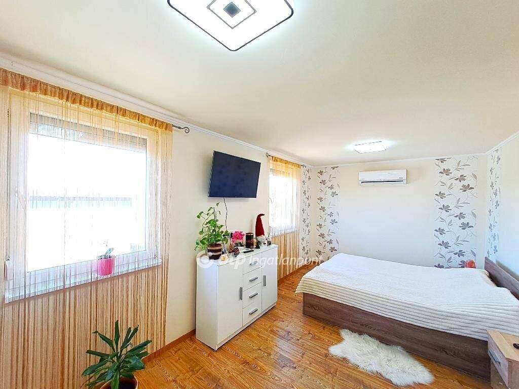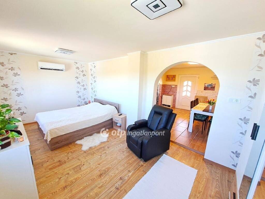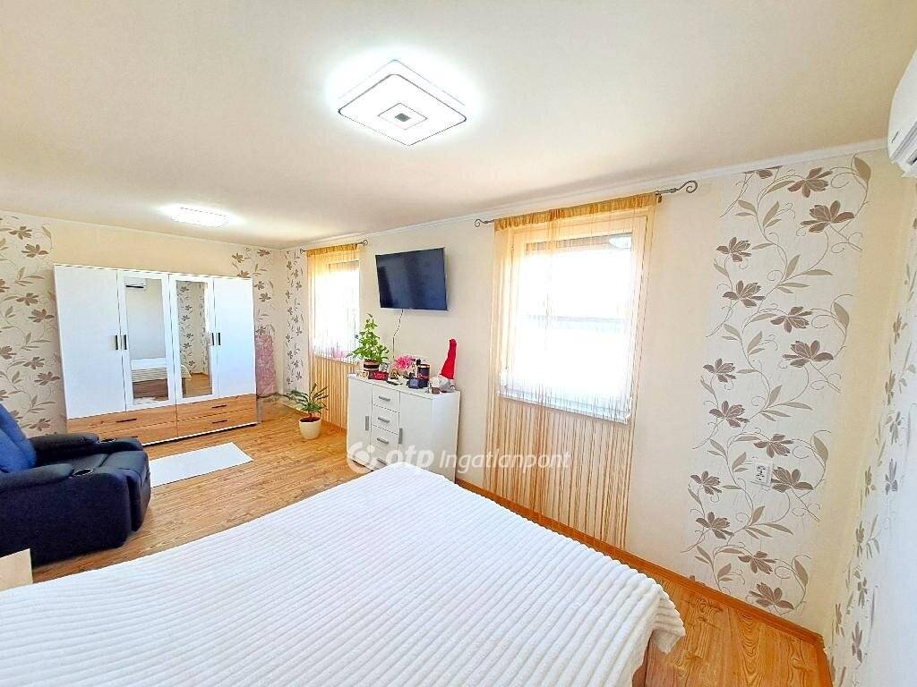 Bács-Kiskun vármegye, Tiszakécske-Kerekdombon, a Thermálfürdő közelében 39 m2 hasznos nettó alapterületű állandó lakhatásra kialakított hétvégi ház, 18 m2 nagyságú fedett terasszal és 15 m2 nagyságú garázzsal 300 m2-es telken eladó! Az 1980-ban épült ingatlan belterületi besorolású, jelenleg állandó lakhatásra kialakított. Az épület és udvara teljes felújításon esett át. A ház beton alapon tégla falazattal, beton födémen bitumenlemezzel és újraszigetelt lapostetővel készült. A homlokzat kőporozásra előkészített, körben 6 cm hőszigeteléssel ellátott. Az újonnan épített fa teraszfedés héjazata trapézlemez fedést és körben csatornát kapott, járólapos burkolása folyamatban van. A külső nyílászárók és a bejárati ajtó hőszigetelt műanyagra cseréltek, körben redőnnyel és szúnyoghálóval ellátottak. A belső terek elválasztására új műanyag borítású ajtó került beépítésre. A lakóépületben egy szoba, egy nappali, egy konyha, egy fürdőszoba-WC helyiség és egy 18 m2-es fedett terasz kapott helyet. Az ingatlanhoz tartozik még egy 15 m2 nagyságú szabvány lemezgarázs is. A lakóegység helyiségei laminált padló- és járólap burkolatot kaptak. A közművek közül a cserélt belső hálózatú egyfázisú 32 Amper villany-ellátás, valamint a H-tarifás plusz mérő, Fi-relével és körökre rendezett kismegszakítóval, a vezetékes víz-ellátás, valamint az emésztő rendelkezésre állnak. Az otthon melegéről két 3,5 KWh-teljesítményű hűtő-fűtő klíma, a fürdőszobában elektromos törölköző-szárító gondoskodik. Alternatív megoldásként egy vegyestüzelésű kémény is megépítésre került. A ház melegvíz ellátását egy 49 literes villanybojler adja. Az épület keresztben átszellőztethető. Az ingatlan belső bútorzattal és a komplett konyhai berendezéssel együtt eladó. Az udvar igényesen parkosított, térkövezett, murvázott és füvesített, körben bekerített. Gépjárművek behajtására kapubejáró, a védelem szempontjából kamera-rendszer biztosított. Az udvar hátsó részében álló garázs igény szerint elforgatható vagy a telek végében lévő szolgalmi út felőli kapu létesítésével megközelíthetővé válhat. Aszfaltozott út 20 méterre, a tömegközlekedés a főút mentén elérhető, autópálya felhajtó 2-3 km.