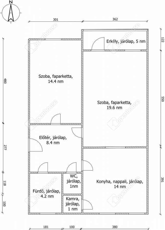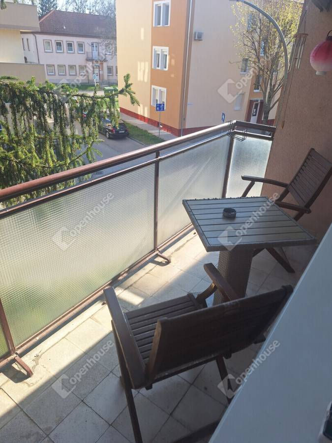 A konyha és a nappali egy légtérben található, innen egy boltíves átjárón is bejuthatunk a nagyobbik szobába. A nagyobbik szobából nyílik az erkély, amit egy nagy fenyőfa közelsége tesz hangulatossá.