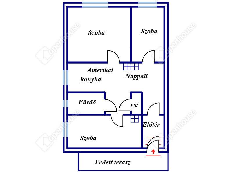 A házba fedett teraszon át belépve kis előtérből közlekedőn át a tágas és napfényes amerikai konyhás nappaliba jutunk. Innen nyílik két hálószoba, majd egy kis közlekedőn keresztül egy kádas kialakítású fürdőszoba wc - vel, egy különálló wc, és a harmadik hálószoba.