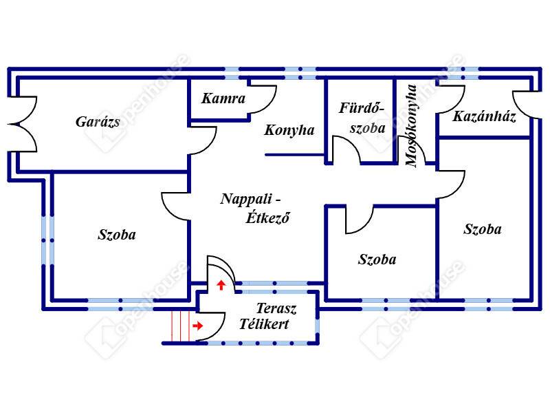 A ház főbejárata egy teraszon keresztül vezet, amely körbeüvegezett, részben polikarbonát tetős, rendkívül napfényes, hangulatos télikertté van kialakítva.