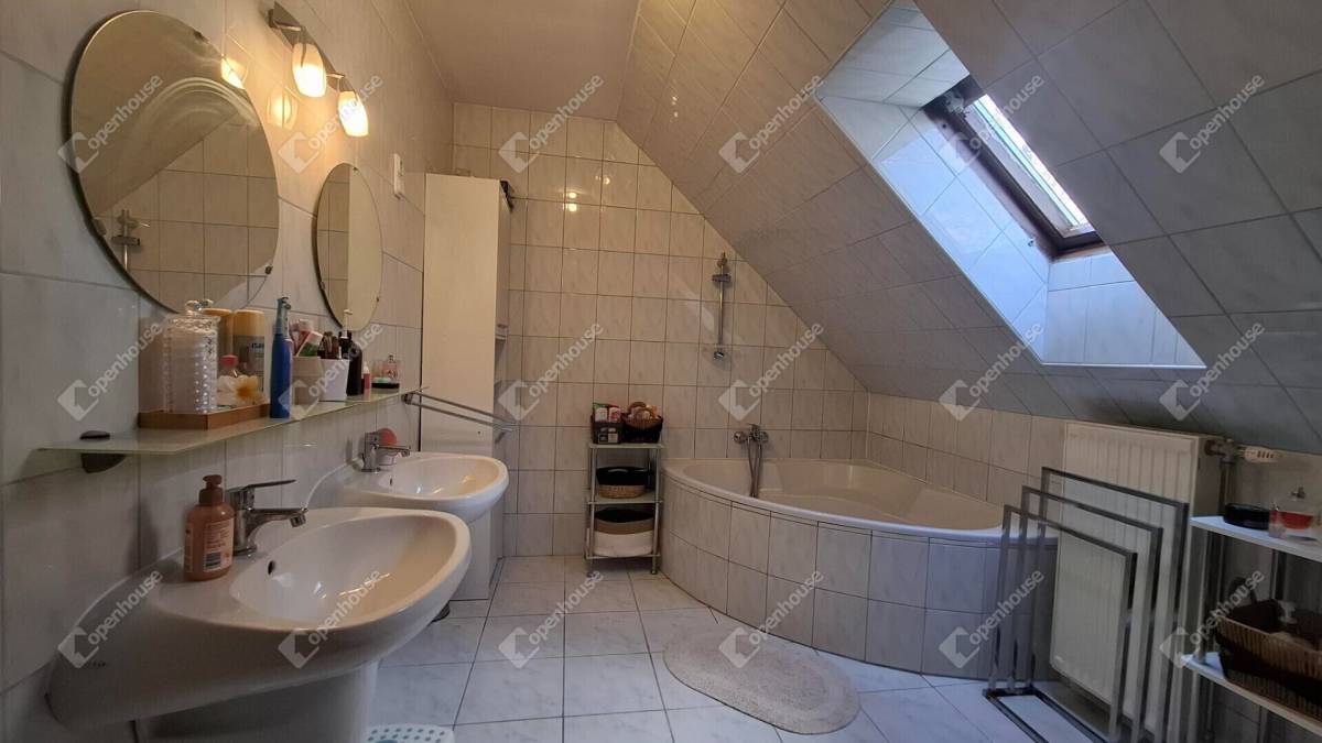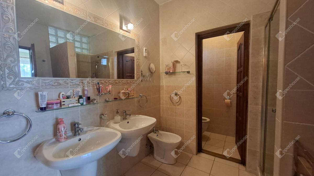 Az emeleti fürdő is különálló dupla mosdóval és sarokkáddal épített, rendelkezik piszoárral, bidével, külön wc helyiséggel.