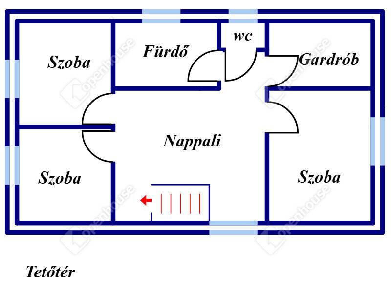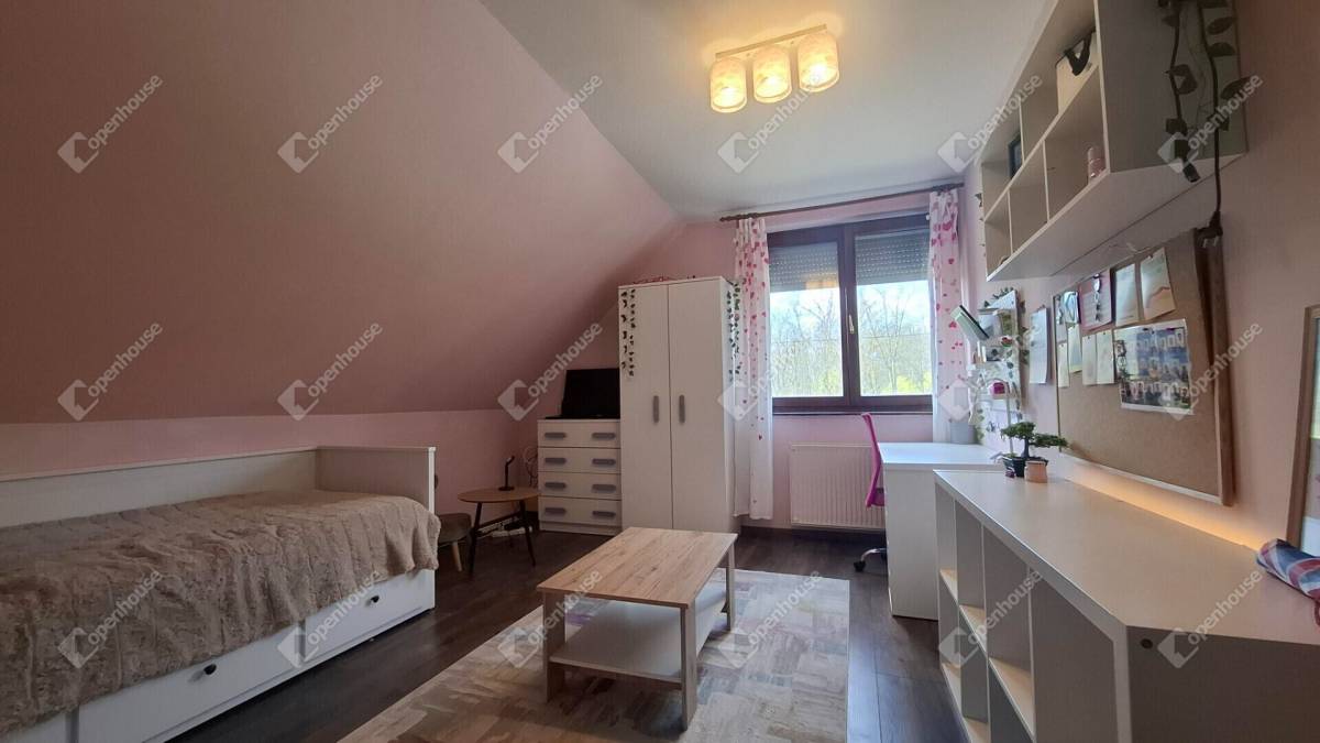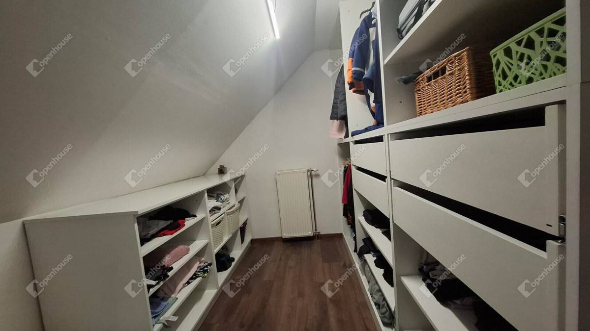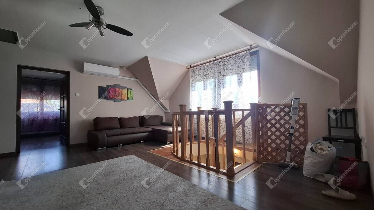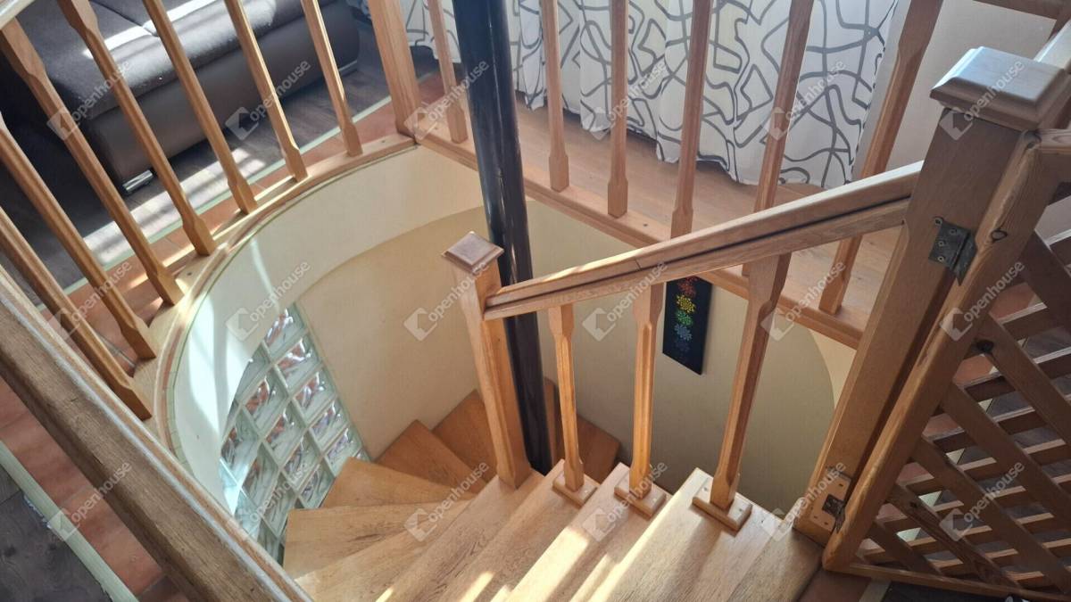 Az emeletre a főbejárat utáni előtérből prémium kialakítású és rendkívül biztonságos fa csigalépcsőn tudunk felmenni, ahová belépve a ház második nappalijában találjuk magunkat. Az emeleti helyiségek kivétel nélkül innen nyílnak. Találunk itt három szobát, egy tágas fürdőt és egy jól pakolható gardrób szobát.