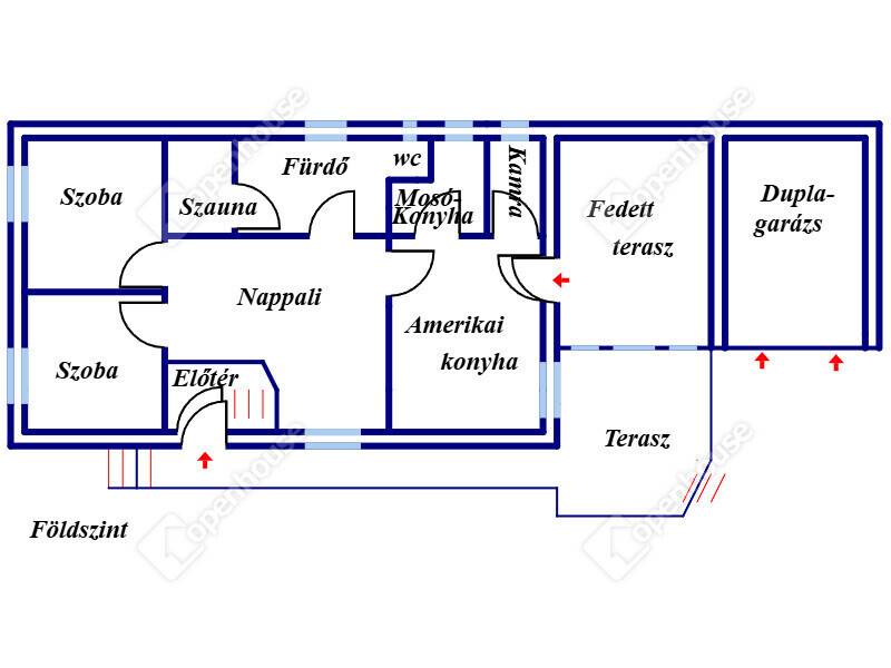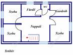 A ház főbejárata egy kis előtéren keresztül vezet minket, ahonnan a földszinti tágas, napfényes nappaliban találhatjuk magunkat. Innen nyílik a két szoba, majd az étkezős konyha, egy mosókonyha és a kamra.
