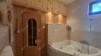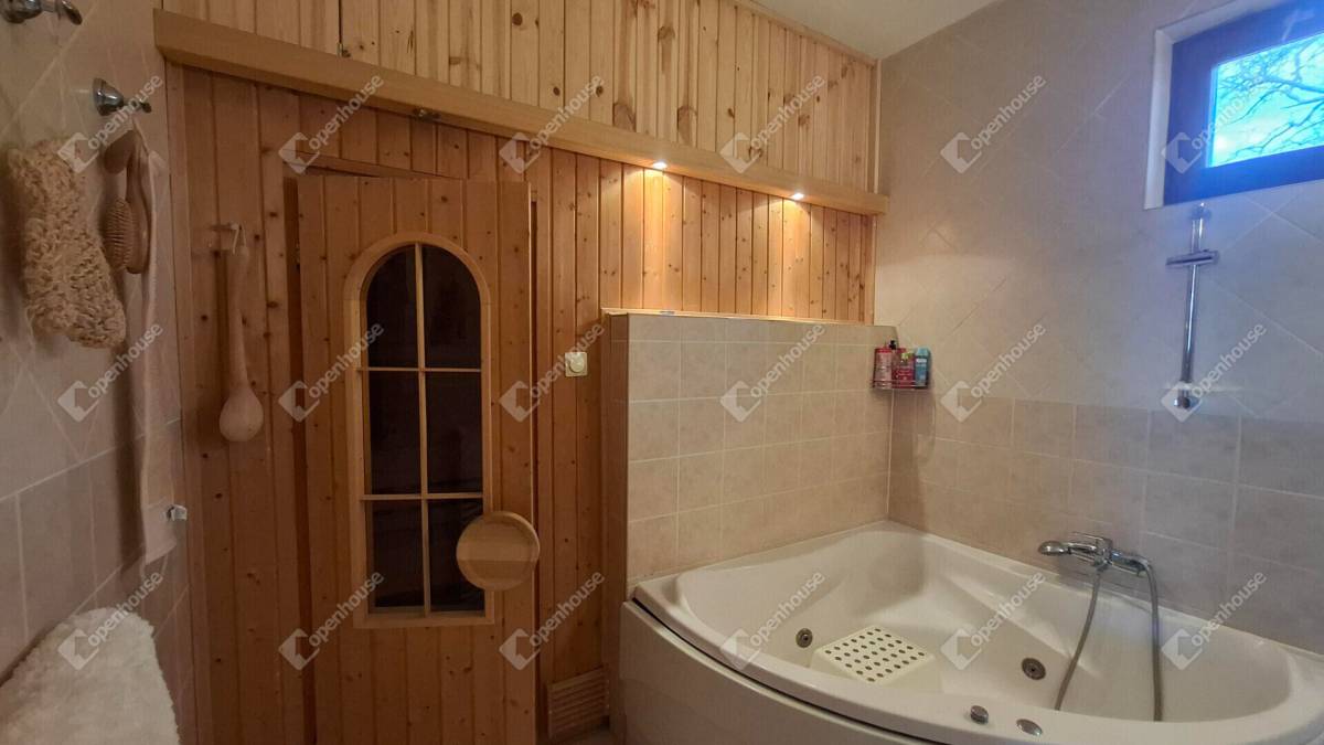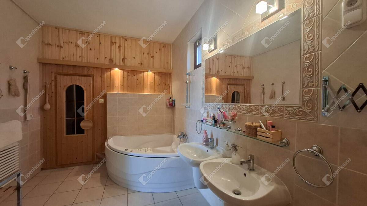 A fürdő hidromasszázsos sarokkádas kialakítású, két különálló mosdóval, külön wc - vel és egy kényelmes finn száraz szauna helyiséggel.