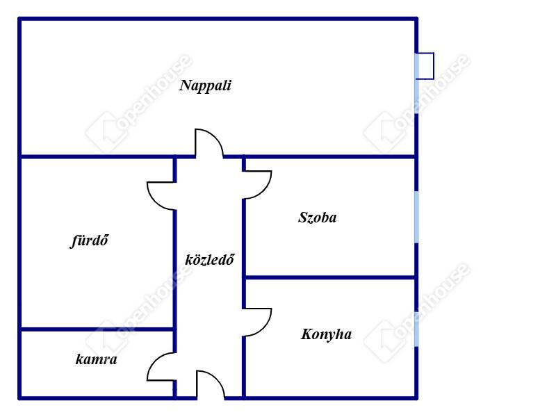 A lakásba belépve, a folyosóból nyílik a konyha, tágas nappali, kis szoba, fürdőszoba zuhanyzóval WC-vel és a kamra.