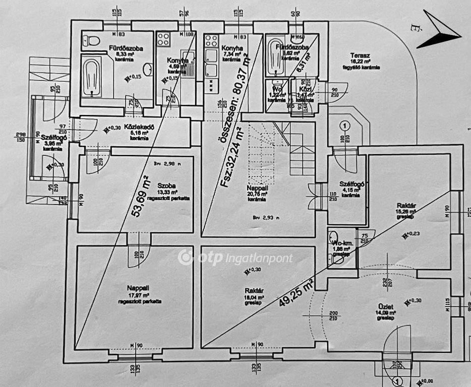 - Utcafronti üzlethelyiség: 3db szoba (raktárak + üzlethelyiség), WC