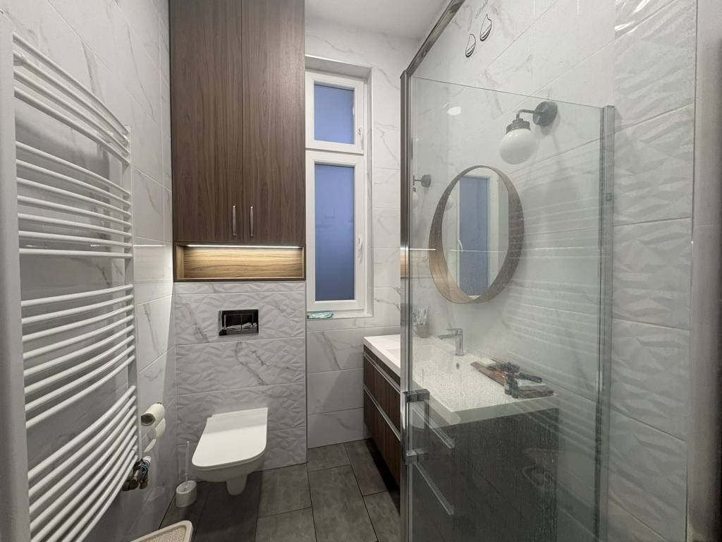 Az ingatlan igényesen kialakított, zuhanyzós fürdőszobával, praktikus kamrával és teljesen felszerelt, gépesített konyhával rendelkezik. A lakás bútorozott, azonnal költözhető állapotban várja új bérlőjét.