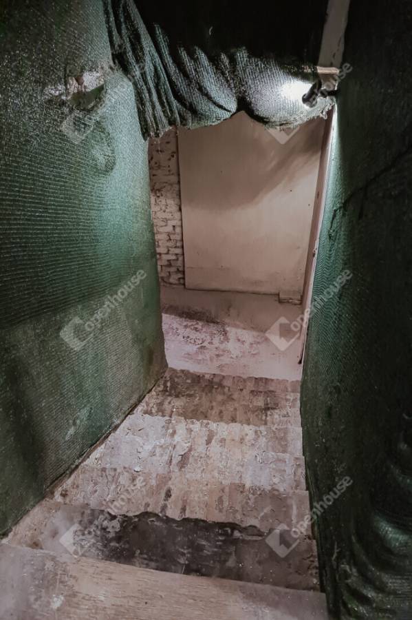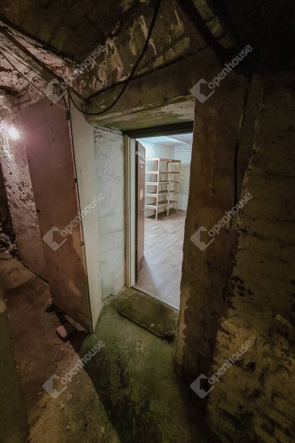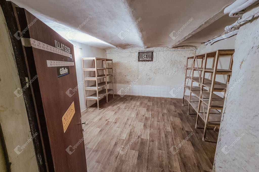 Az alagsori helyiség kivilágított lépcsőházon át közelíthető meg. Jó állapotú, zárható faajtón keresztül lépünk az egy légterű, 2,25 m belmagasságú, 20 m²-es helyiségbe, mely fa hatású PVC műpadlóval borított. A pince nem vizesedik, levegője száraz, szellőzését elektromos ventilátor segíti. A világításról egy falra szerelt nagy fényerejű UFO-lámpa gondoskodik. Két nagyméretű pozdorja polc található a helyiségben, melyek igény szerint használhatók.