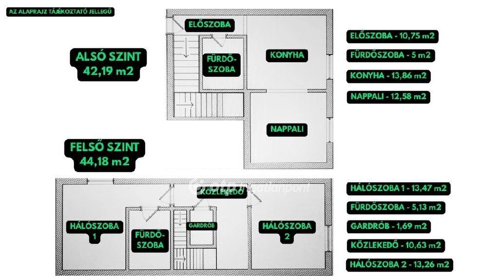 Az alsó szinten tágas amerikai konyhás nappali és étkező található modern konyhabútorral és Bosch beépített mosogatógéppel, valamint egy zuhanyzós fürdőszoba található. A felső szinten két szoba, gardrób és egy második, fürdőkádas fürdőszoba kapott helyet, ami a hálószobából nyílik.