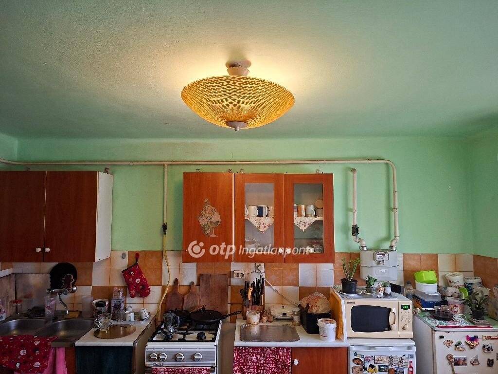 A 180 nm-es, beton alapra, tégla falazattal készült ingatlan a központhoz közel található. A földszinten két szoba, konyha, közlekedő, kamra, előszoba, közlekedő, fürdőszoba wc-vel helyiségek vannak. Az emeleti részen további 4 szoba, külön fürdőszoba és wc található. A szobák parkettásak, a többi helyiség járólappal burkolt. Az otthon melegét gázkazán biztosítja, radiátoros hőleadással.