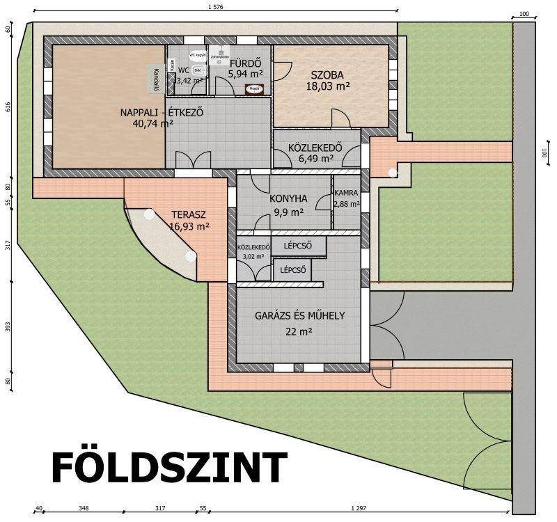 A házon belül 22 nm-es garázs és műhely található beépített polcrendszerrel.