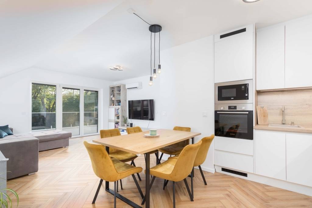 Az ingatlan egyedisége a részletekben rejlik: A 70 m²-es belső tér elosztása tűpontos: a tágas amerikai konyhás nappali mellett két külön hálószoba biztosítja az intimitást. Az igazi „wow-faktor” azonban a lakást körülölelő, 90 m²-es terasz, amely nemcsak méretével, hanem funkcionalitásával is lenyűgöző: minden szobából közvetlenül kiléphetünk rá, így a külvilág és a belső terek eggyé válnak.