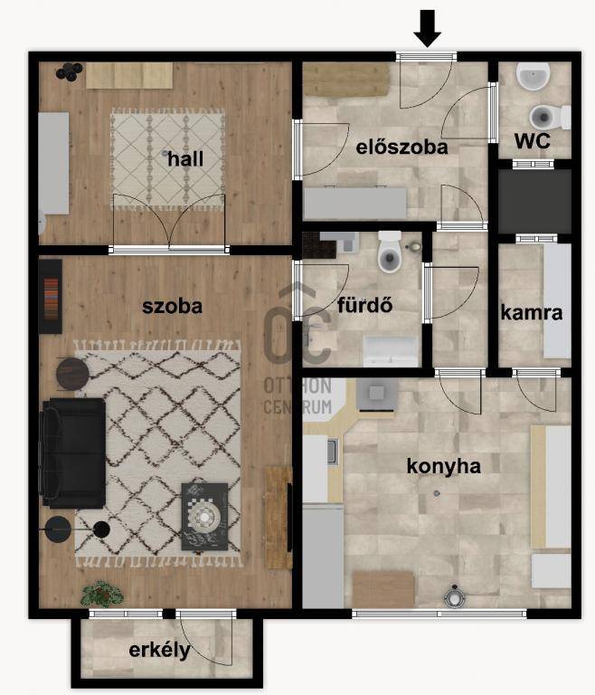 Elosztását tekintve szoba, hall, nagyméretű konyha, kamra, fürdőszoba WC-vel és egy külön WC.
