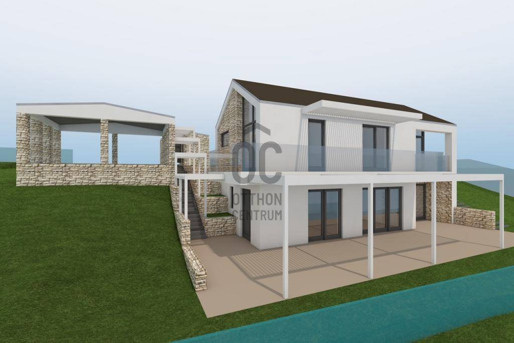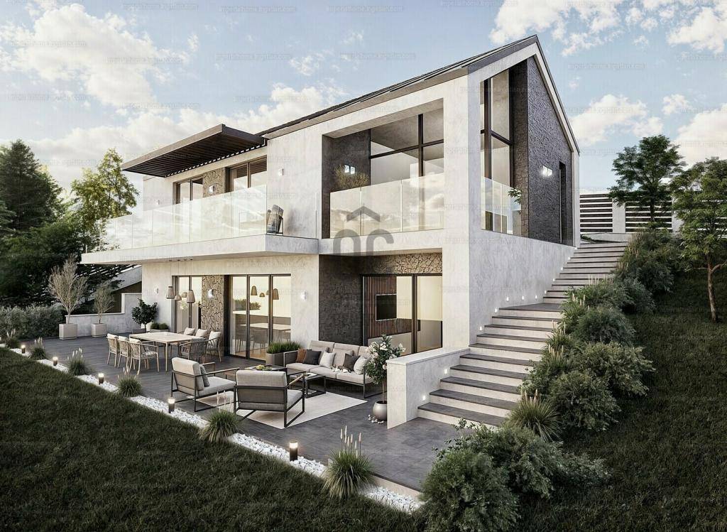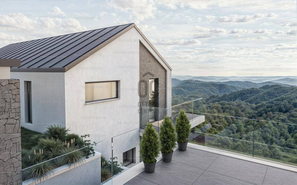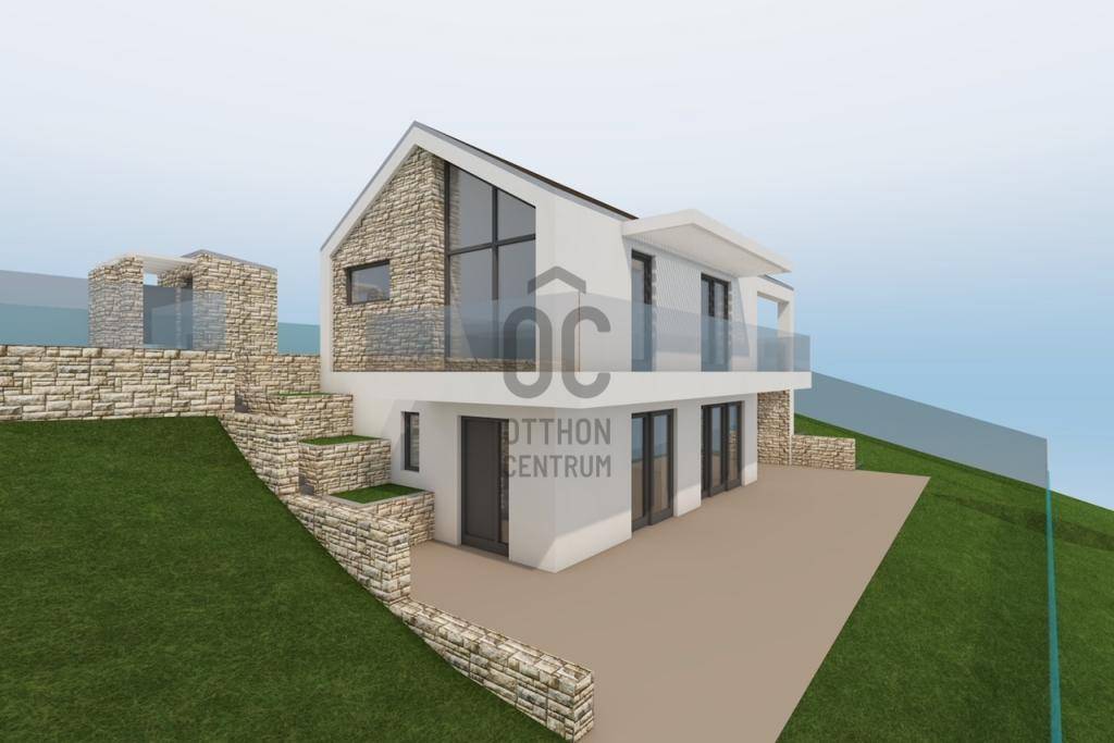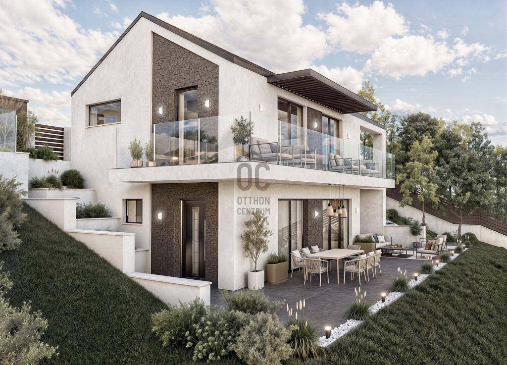 970 nm-es, közel sík telken helyezkedik el az ingatlan, igény szerint borospince, medence, szaunaház (finn-és gőzszaunával) is kialakítható, készültek róla tervek. Két autós fedett garázs külön épületben, de összekötve a házzal. Az épület rendkívül praktikus elrendezésű, 100 nm teraszfelülettel bír két szinten a hihetetlen panoráma irányába, valamint ezt jól kihasználó gigantikus üvegfelületekkel.