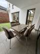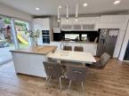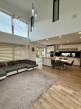 Az átgongolt kialakítású, 2021-ben épült, kétszintes ikerház tágas, nagy belmagasságú amerikai-konyhás nappalija, hatalmas üvegfelületei különleges hangulatú otthont teremtenek.