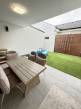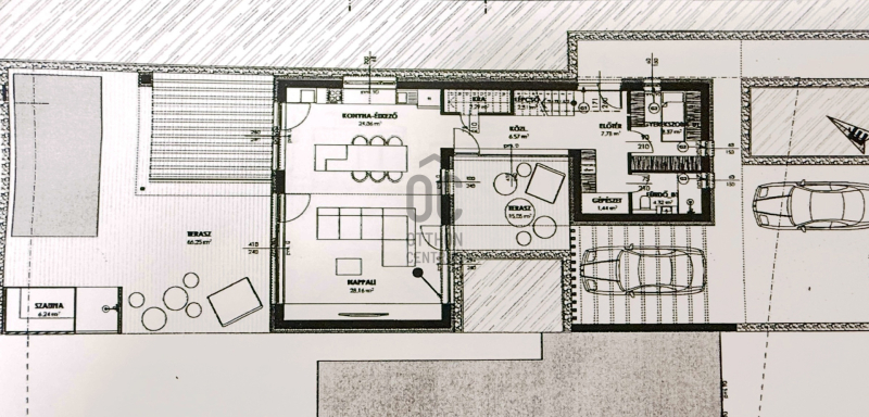 A különleges beosztású ház nappalija két irányban is kertkapcsolatos, az egyik belső átriumos, intim, és minden időjárásban praktikusan használható mert félig fedett, míg a ház mögött egy terasz kapcsolatos nagyobb kert került kialakításra, ahol még egy kis játszótér is helyet kapott. Automata öntözőrendszer gondoskodik a szép zöld kert fenntartásáról, míg a kerti tároló praktikus megoldást kínál a kinti eszközök és bútorok tárolására. Az elektromos autó töltés lehetősége is adott, így a környezettudatos életmód híveinek is ideális megoldást nyújt.