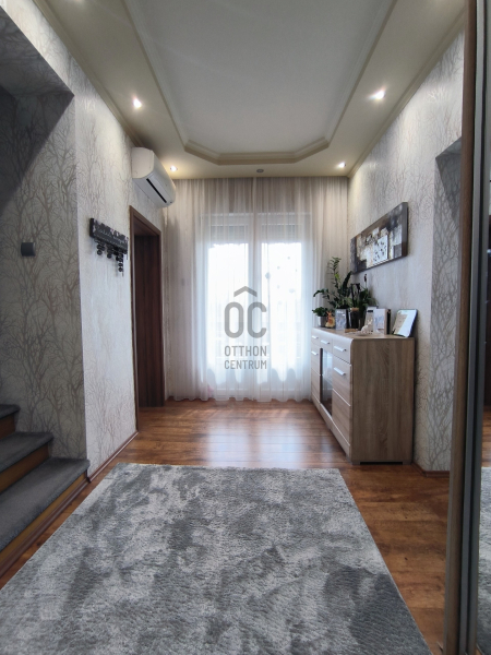A házban 5 tágas szoba található, amelyek világosak és barátságosak, emellett két modern fürdőszoba is rendelkezésre áll, ami a nagycsaládosok kényelmét szolgálja. A konyha és az étkező egy légtérben van, így családi és baráti összejövetelekre is kiválóan alkalmas. 2 szobához gardrób helyiség lett kialakítva, ami a hölgyek álmát valósítja meg. Az egész ingatlan az igényességet és a harmóniát árasztja, modern, fiatalos színvilággal. Korszerű energetikai berendezések, 7,5 KW-os napelem és a hozzá tartozó tárolónak, a hőszigetelésnek és köztes elhelyezkedésének köszönhetően alacsony a fenntartási költsége. A 30m2-es garázs akár 2 autó beállását is lehetővé teszi az elektromos kapukon keresztül. A házban a riasztó és-kamera rendszer is ki lett építve.