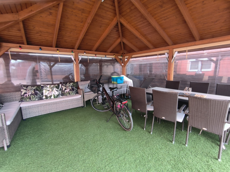 A térkövezett udvarban található a nagy méretű, téliesíthető filagória, amelyet a vételár tartalmaz.