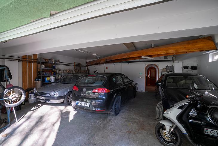 A 3 kocsis garázs mellett egy fedett autóbeálló biztosít tárolási lehetőséget.