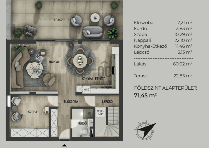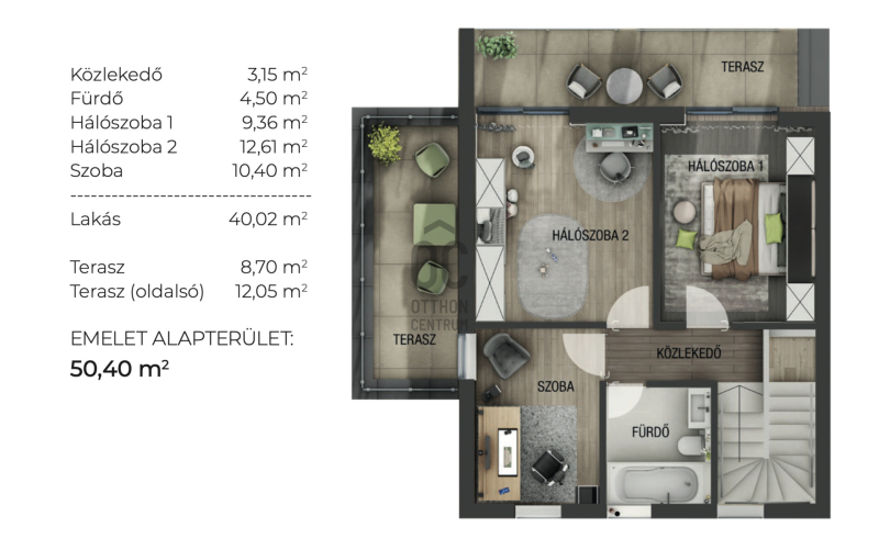 Az ingatlan 121,85 m²-es, két szinten elosztva, összesen 5 szobával és három terasszal rendelkezik. A tágas és világos tereket a délnyugati tájolás és a Hármashatár-hegyre nyíló kilátás teszi igazán különlegessé.