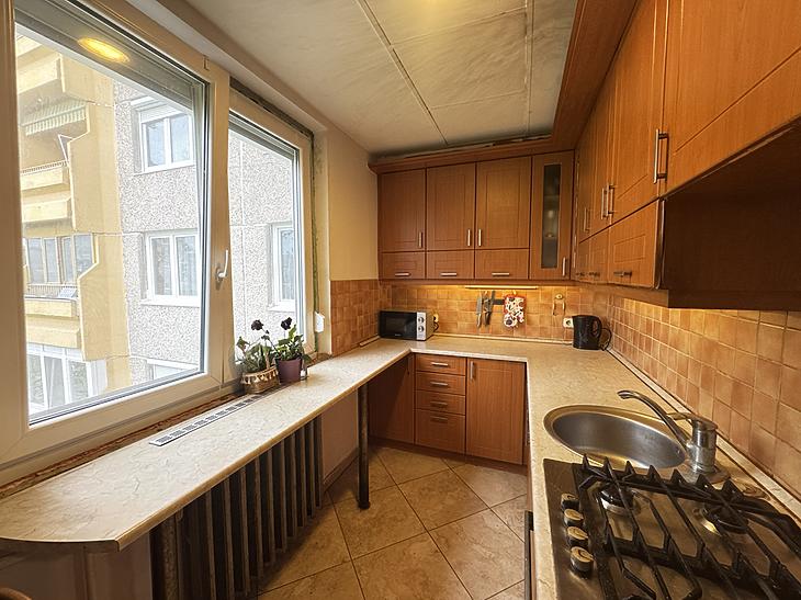 A konyha tágas, világos, nagy ablakkal rendelkezik, így a természetes fény szinte egész nap beárad. Bútora újabb, jó állapotú, a mindennapi használathoz kényelmes elrendezéssel, és beépített elektromos sütővel felszerelt.